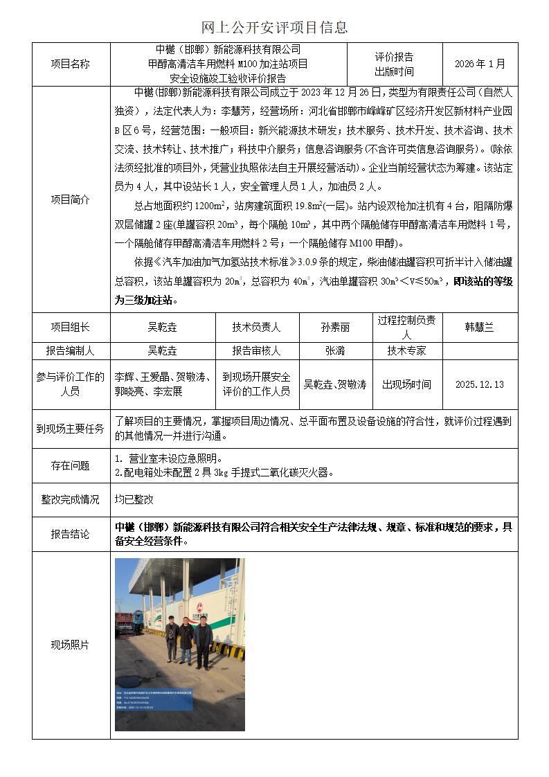 中樾(邯郸)新能源科技有限公司甲醇高清洁车用燃料M100加注站项目安全设施竣工验收评价