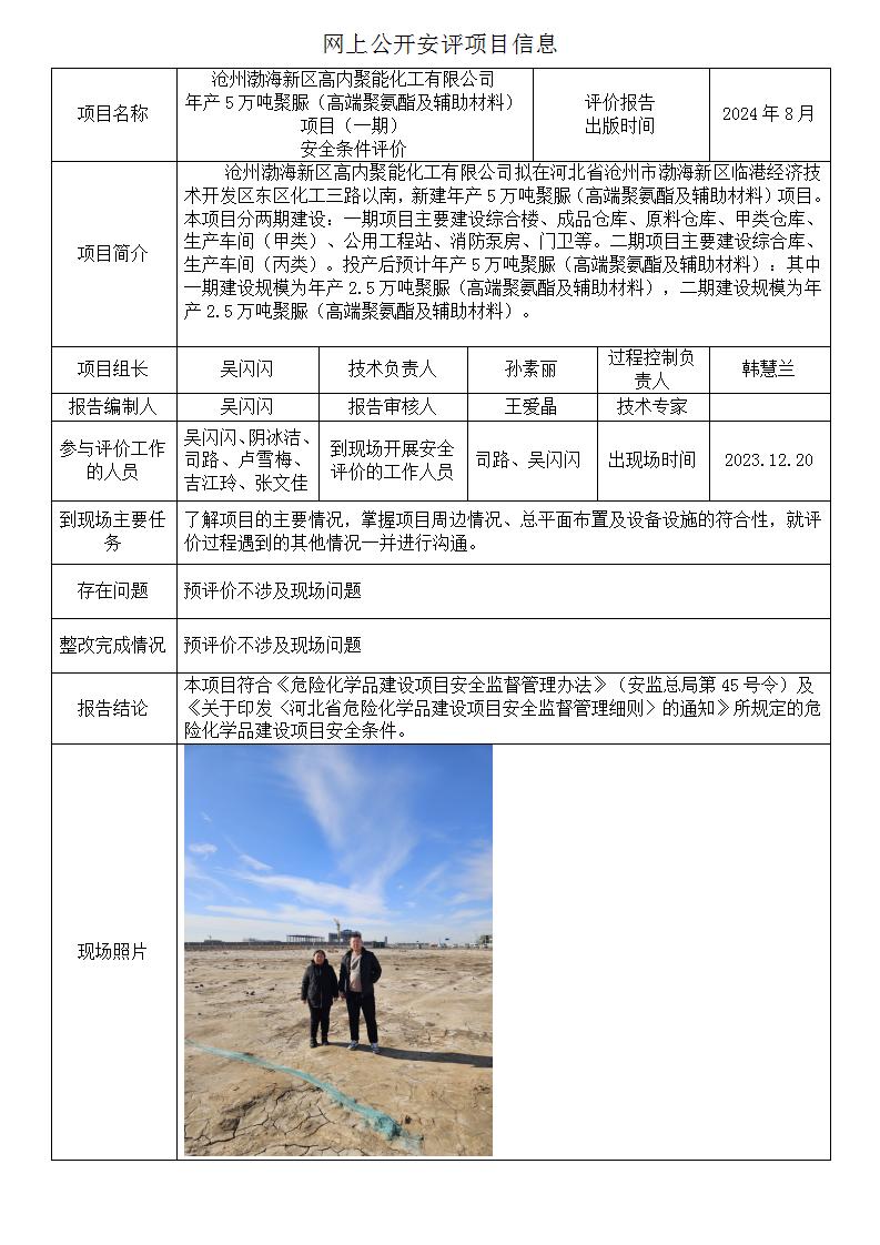 沧州渤海新区高内聚能化工有限公司 年产5万吨聚脲(高端聚氨酯及辅助材料)项目(一期) 安全条件评价