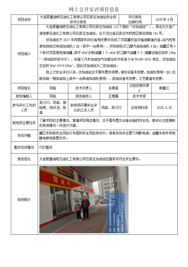 大连君盟油吧石油化工有限公司石家庄加油站安全现状评价报告