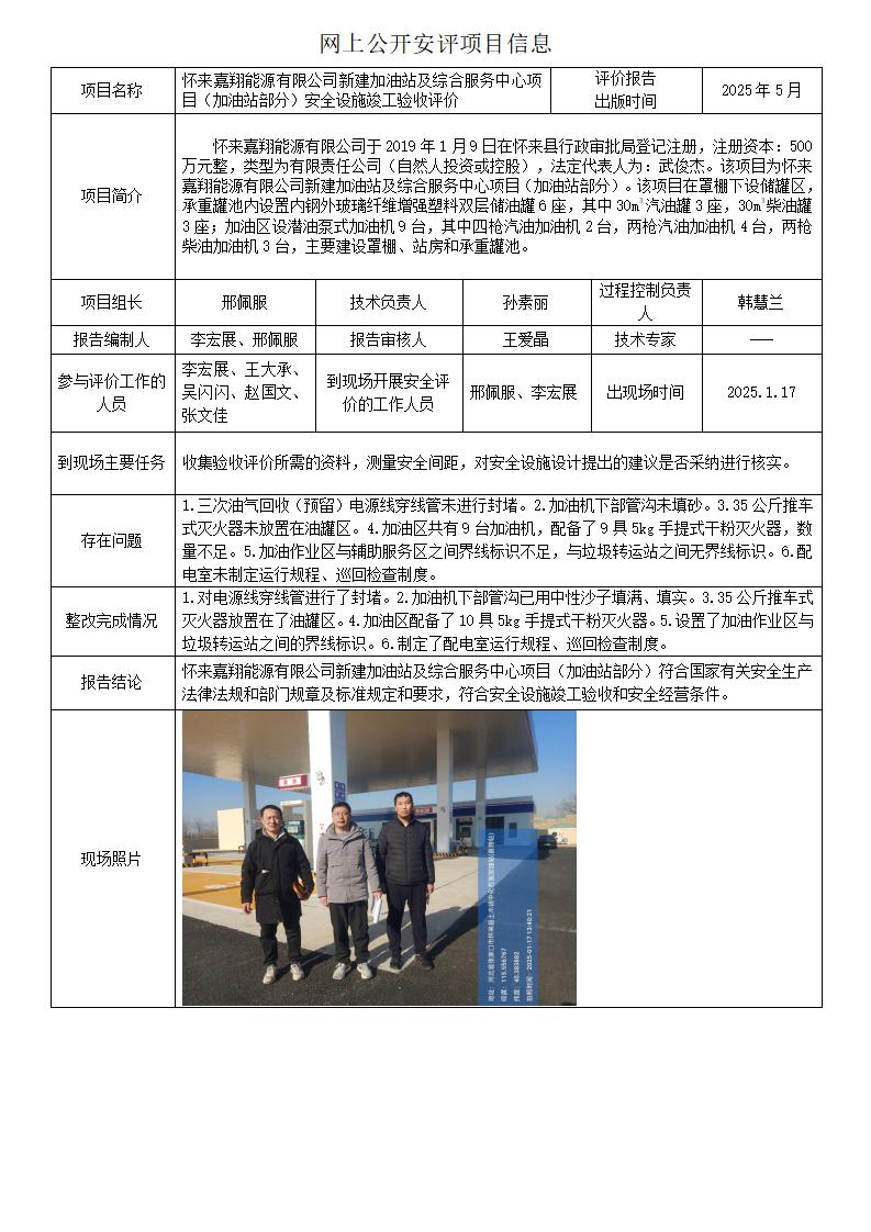 怀来嘉翔能源有限公司新建加油站及综合服务中心项目(加油站部分)安全设施竣工验收评价