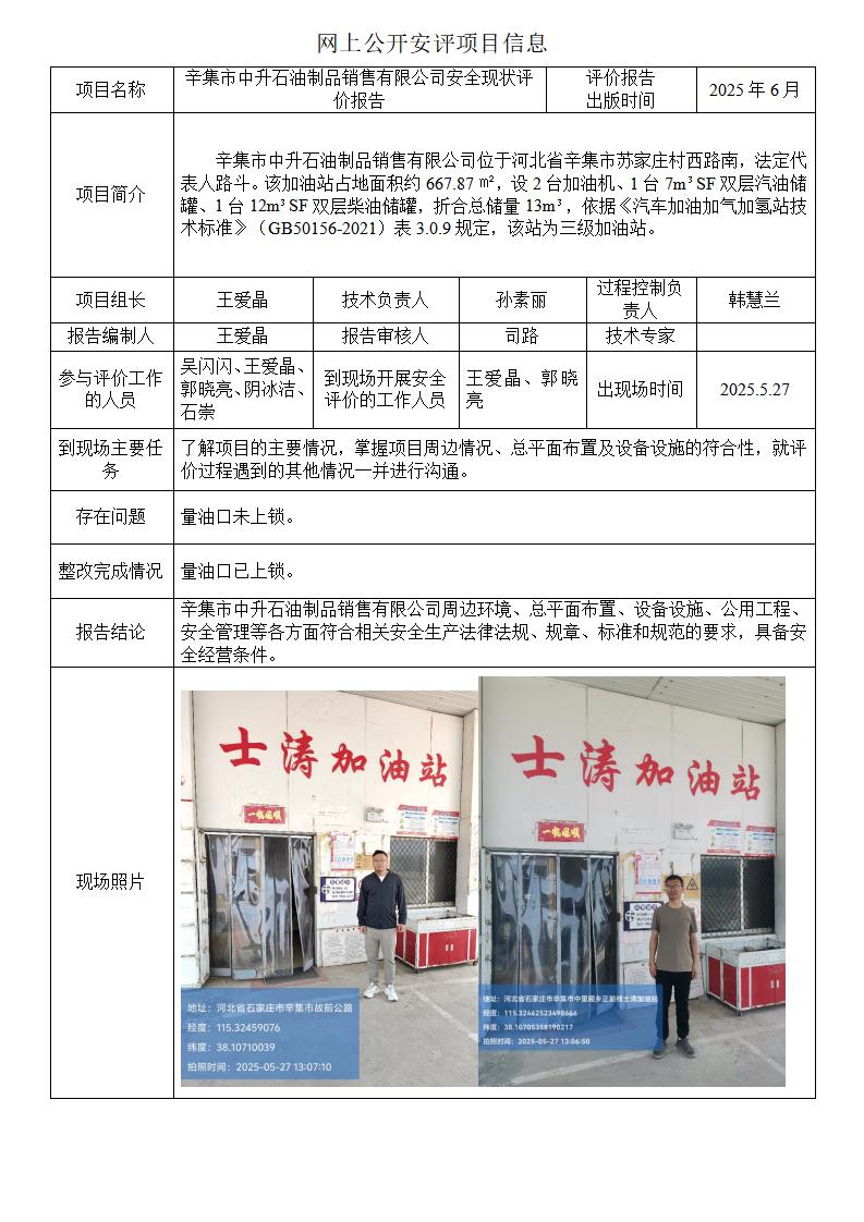 辛集市中升石油制品销售有限公司安全现状评价报告