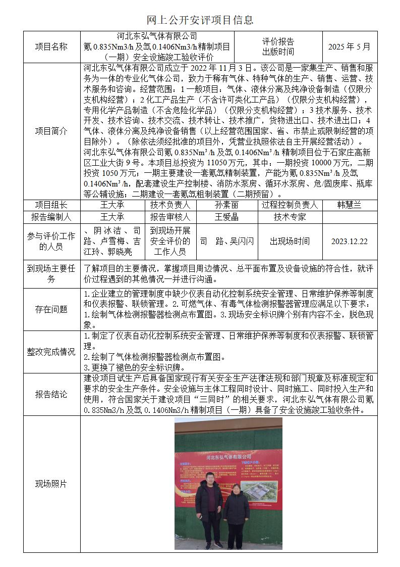 河北东弘气体有限公司 氪0.835Nm3/h及氙0.1406Nm3/h精制项目(一期)安全设施竣工验收评价