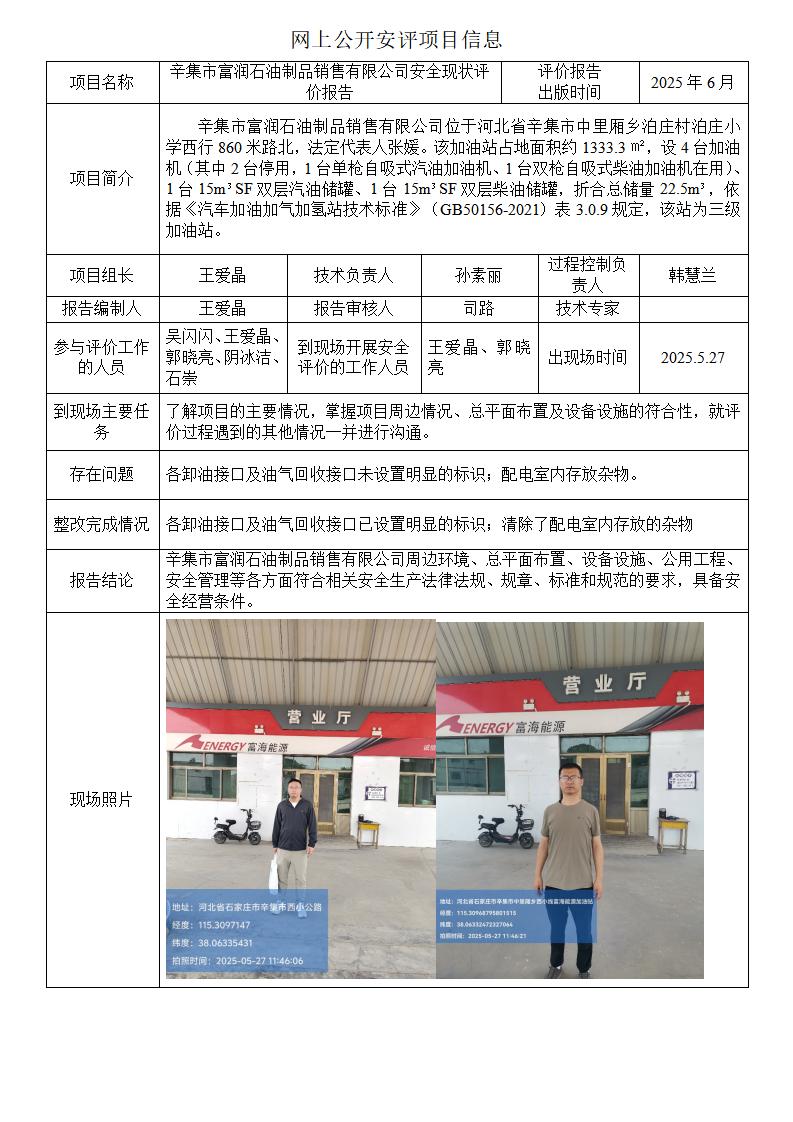 辛集市富润石油制品销售有限公司安全现状评价报告