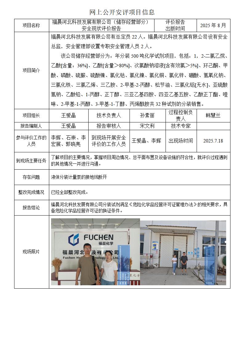 福晨河北科技发展有限公司(储存经营部分)安全现状评价报告