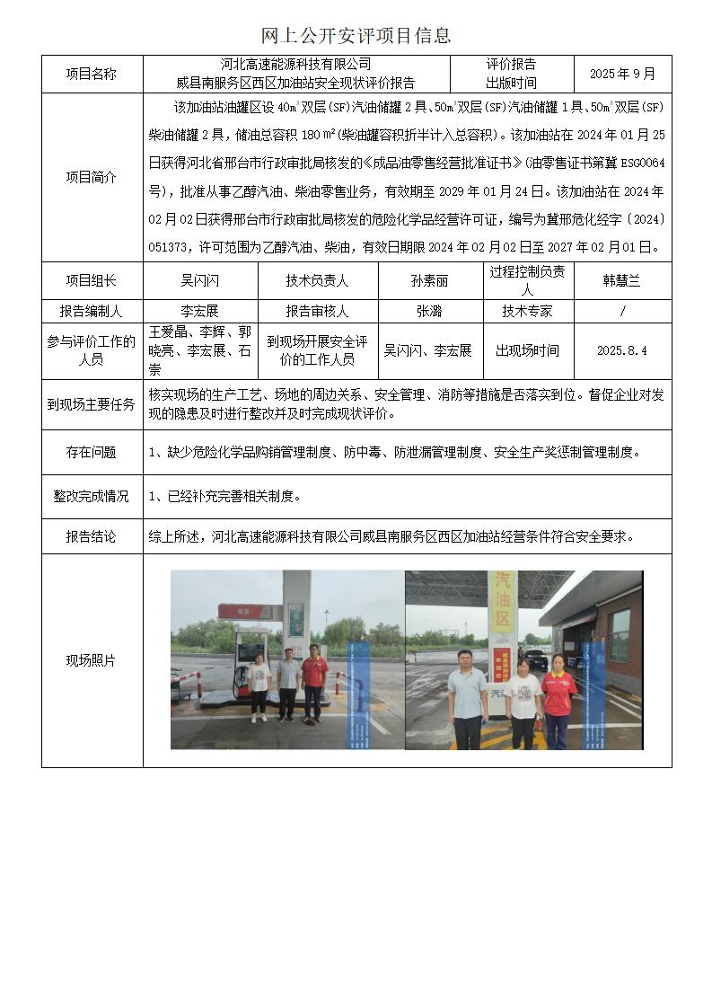 河北高速能源科技有限公司威县南服务区西区加油站安全现状评价报告