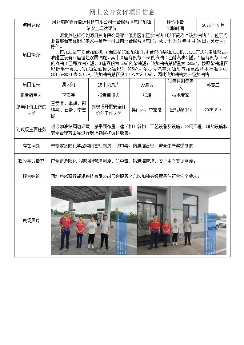 河北燕赵驿行能源科技有限公司邢台服务区东区加油站安全现状评价