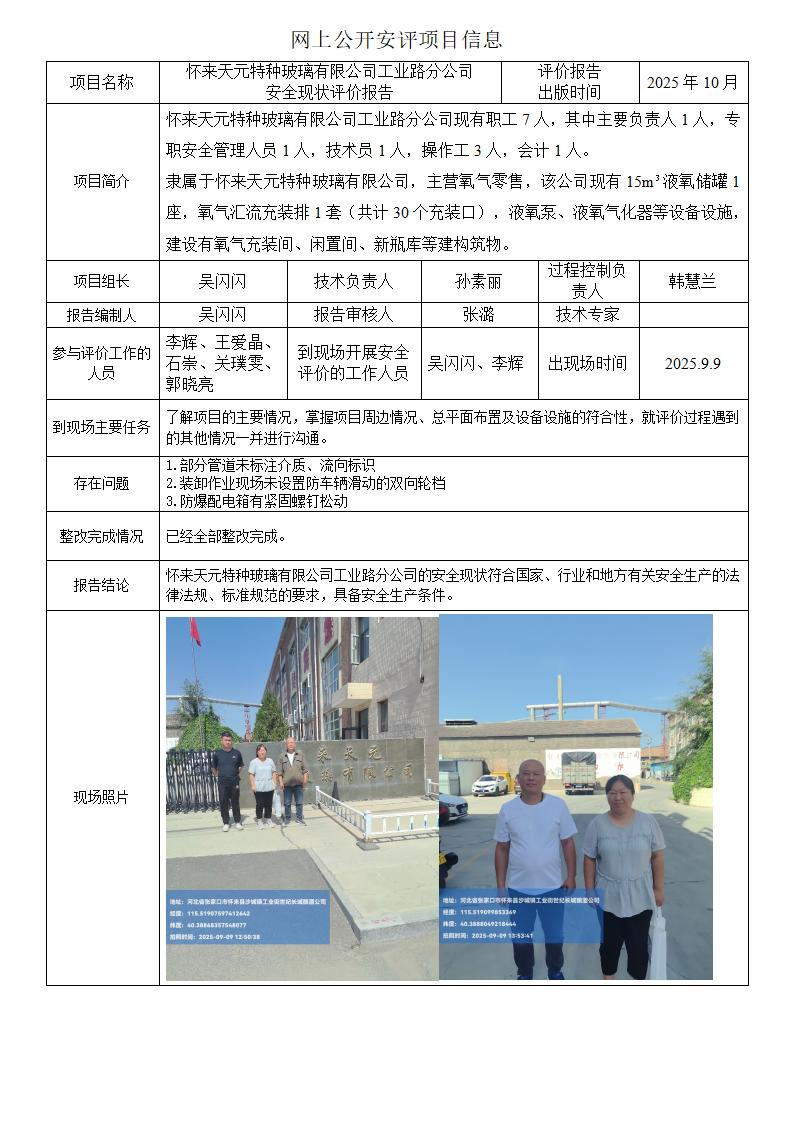 怀来天元特种玻璃有限公司工业路分公司安全现状评价报告