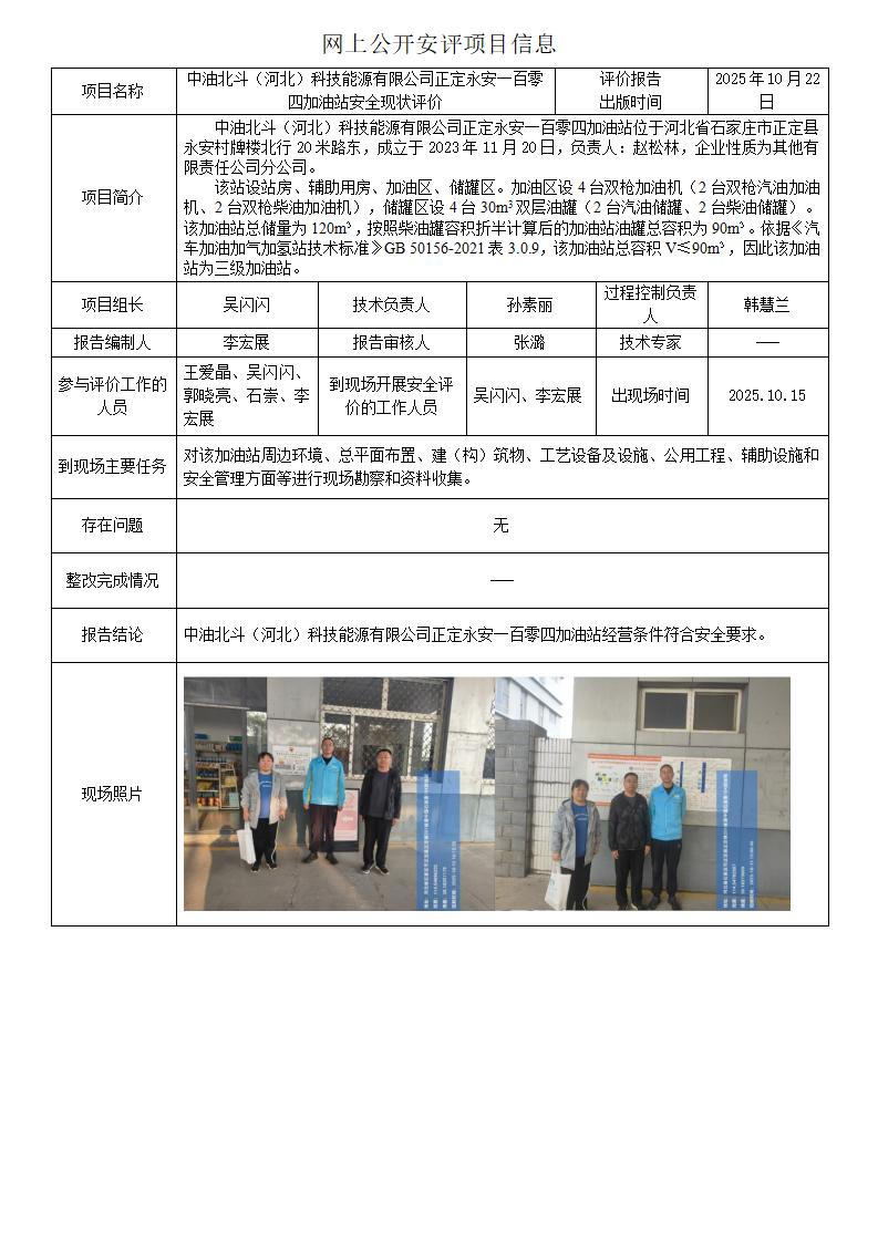 中油北斗(河北)科技能源有限公司正定永安一百零四加油站安全现状评价