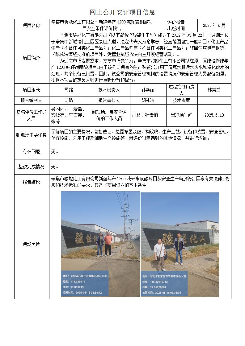 辛集市骏能化工有限公司新建年产1200吨环磺酮酸项目安全条件评价报告