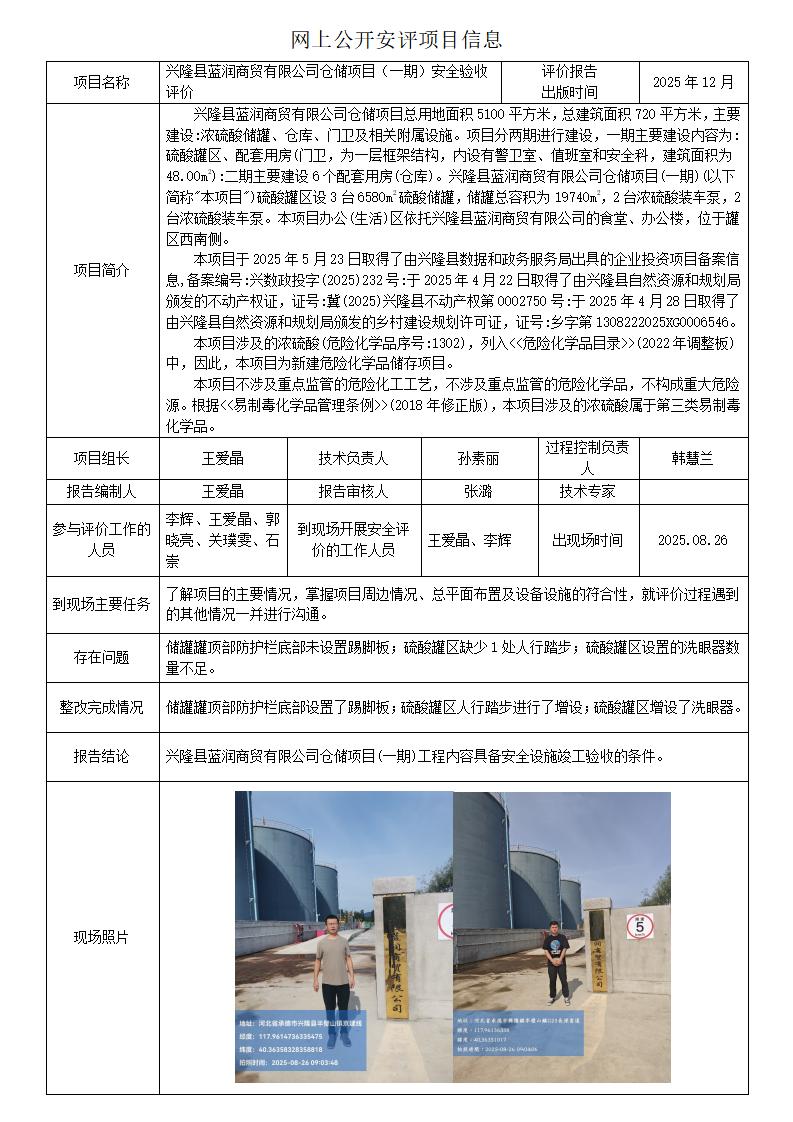 兴隆县蓝润商贸有限公司仓储项目(一期)安全验收评价