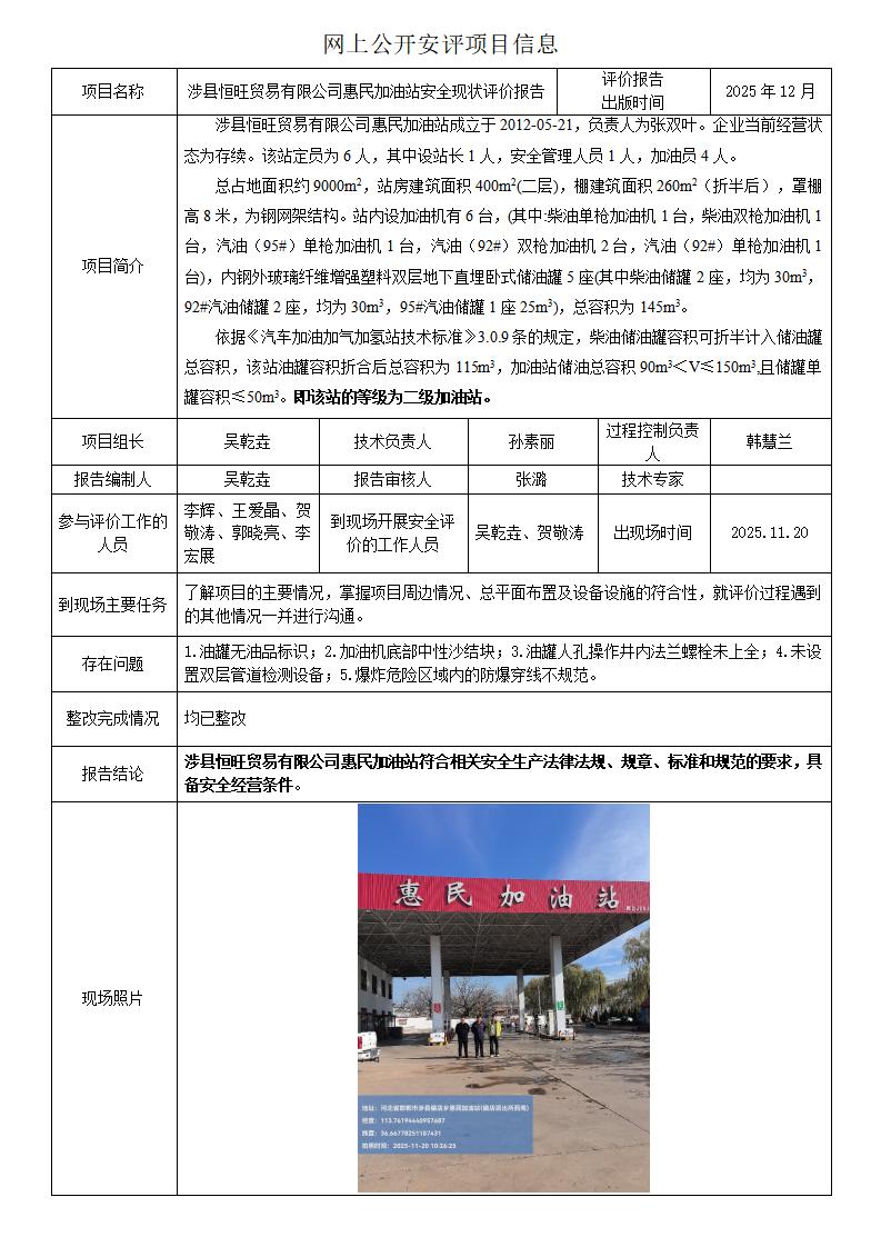 涉县恒旺贸易有限公司惠民加油站安全现状评价报告