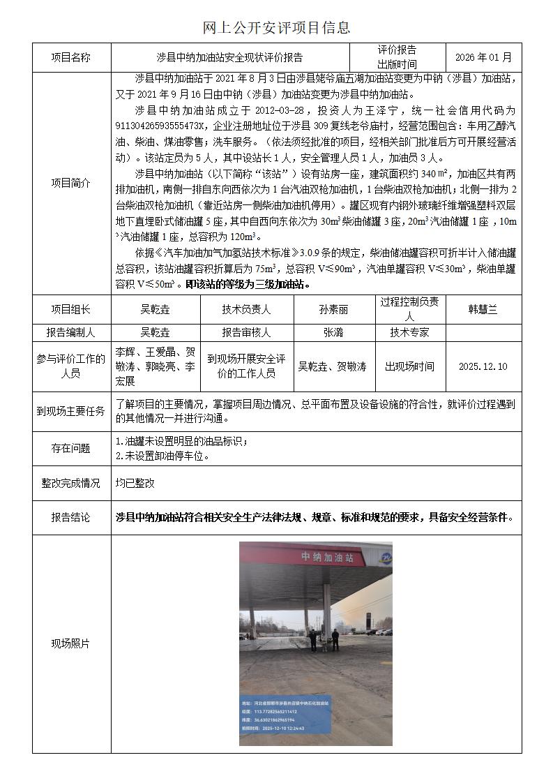 涉县中纳加油站安全现状评价